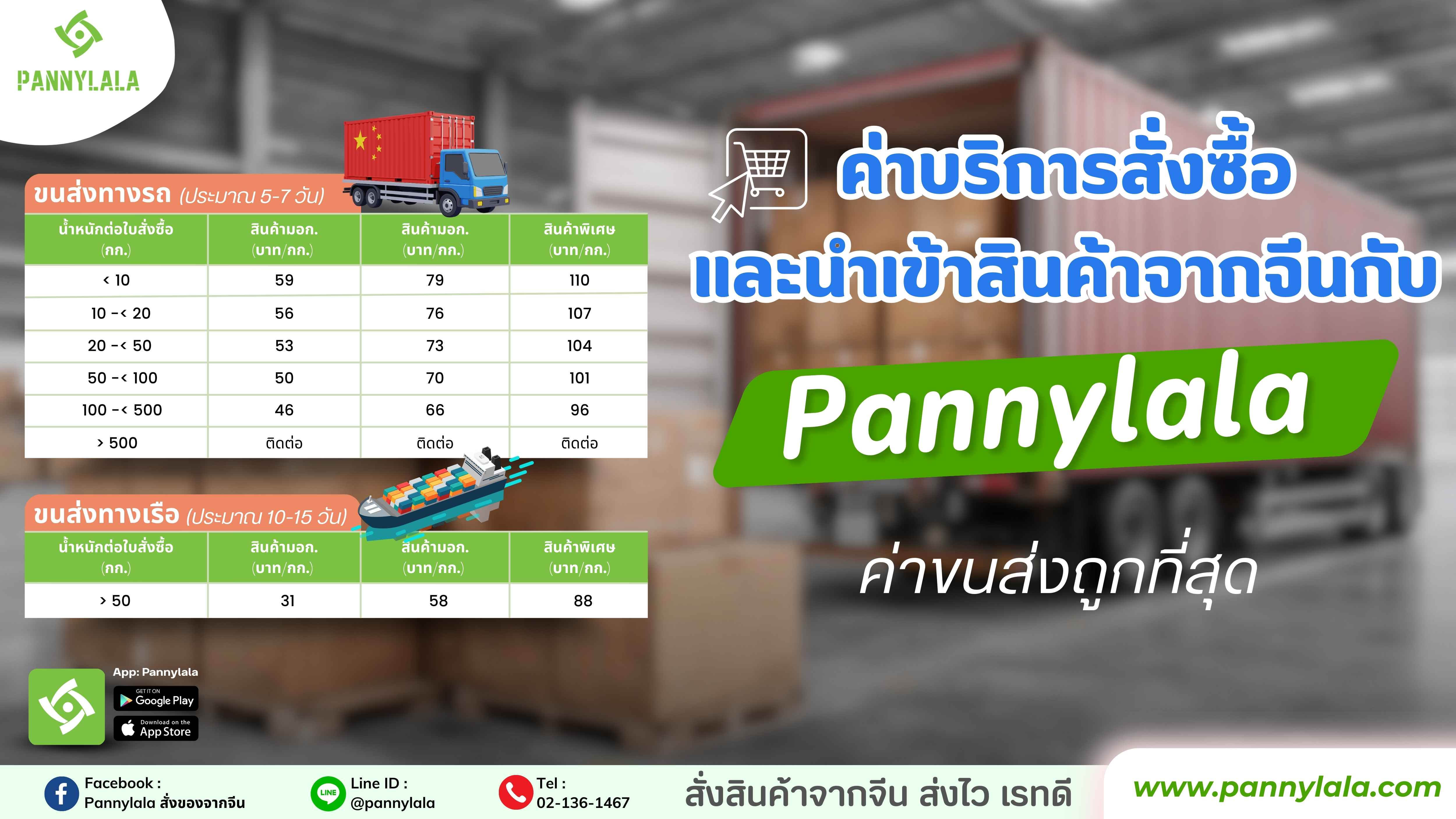 หากค่าขนส่งสูงกว่าเรทปกติของบริษัทขนส่งในจีน (โดยปกติประมาณ 5–12 หยวน/กก. แรก) ทาง Pannylala จะแจ้งค่าส่งผ่านช่องทาง คุยกับ Pannylala ในใบสั่งซื้อ เพื่อให้ลูกค้าทราบและยืนยันการสั่งซื้อต่อ